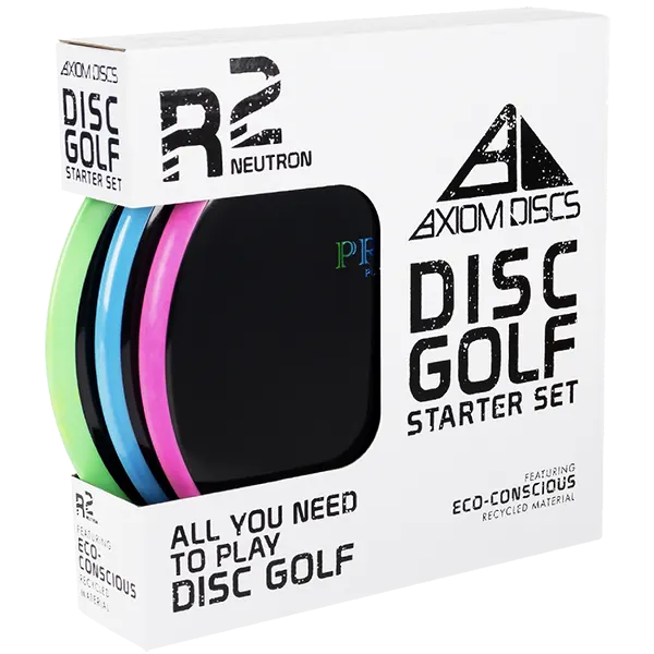 For the first time, our R2 environmentally conscious plastic is available for the Axiom brand! That’s right – everything that you love about the R2 project, but with a dazzling dose of color! Each Axiom disc in the set will have the distinctive R2 black core, but now with color overmolds and a truly beautiful rainbow foil for the stamp. The Axiom R2 Neutron Starter Sets include an Insanity, a Paradox, and a Proxy – a perfect combination of starter discs! Pick one up for yourself or one for your friend who is looking to get into disc golf or GYRO – these starter sets make great gifts!