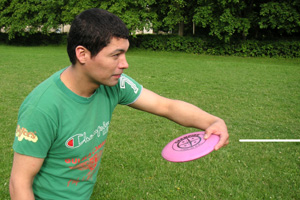 För att kasta långt: kom med sidan i kastriktningen så att du kan hämta discen så långt bak som möjligt och ge maximal längd och fart på svingen.